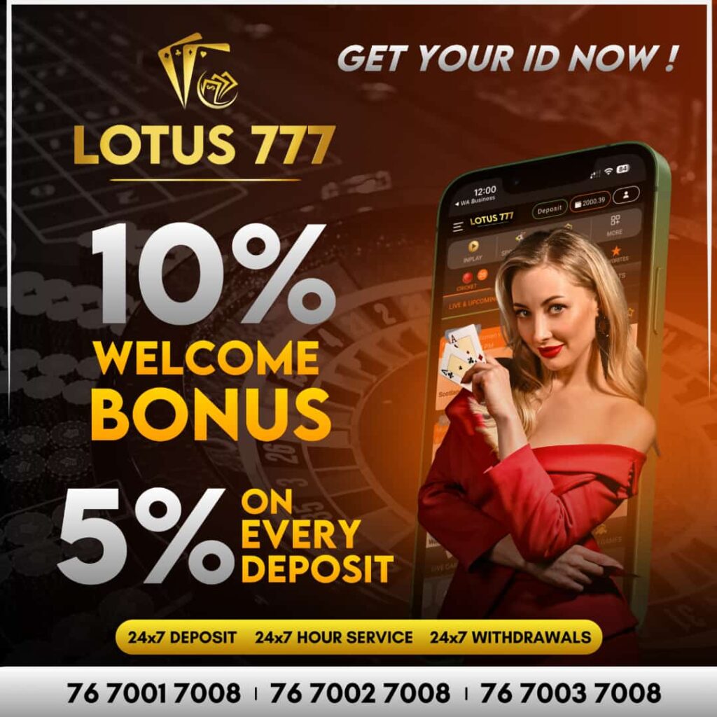Welcome to Lotus 777 Book – the best betting site in India. At Lotus 777 Book, we provide a diverse array of betting options, including sportsbooks, live cards, and live casinos. The best online betting sites India, it is designed to meet the needs of every bettor, from beginners to experienced players. Whether you’re passionate about sports betting, enjoy the strategy of live card games, or seek the excitement of live casino action, we have it all.